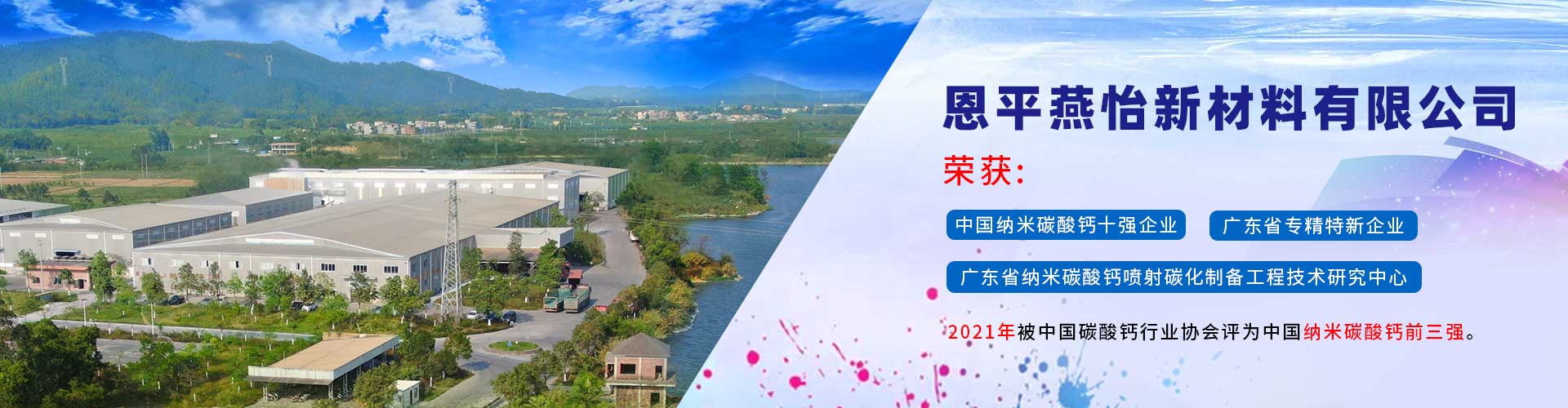 恩平燕怡新材料有限公司成立于2006年,位于廣東省江門恩平市。是一家專注于納米碳酸鈣產(chǎn)品研發(fā)、生產(chǎn)以及銷售服務(wù)的新材料企業(yè)。 公司榮獲 “高新技術(shù)企業(yè)”、 “清潔生產(chǎn)企業(yè)”、“廣東省納米碳酸鈣噴射碳化制備工程技術(shù)研究中心” 、 “中國納米碳酸鈣十強(qiáng)企業(yè)” 、 “廣東省專精特新企業(yè)”等稱號(hào),并通過ISO9001:2015質(zhì)量管理體系認(rèn)證,產(chǎn)品質(zhì)量符合國家行業(yè)標(biāo)準(zhǔn)GB/T19590—2011納米碳酸鈣優(yōu)等品的要求。...